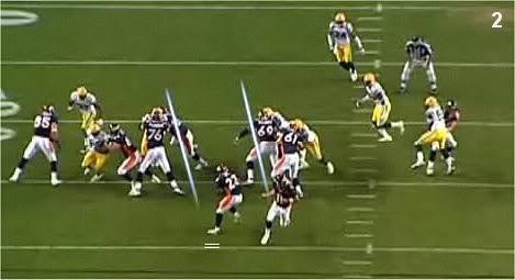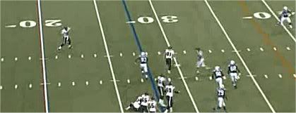 Nakon snapa Reidov playdesign dolazi do izražaja. Jackson odvlači svog CB-a duboko u polje time otvarajući prostor za ostale hvatače u polju. Westbrook nakon chipa se podvlači između 2 LB-a i tu postavlja šator. Brown nakon što je chipovao i naterao DE u Smithov block kreće u svoj Shallow Cross, međutim sam chip je izazvao zabunu i dao korak prednosti Brownu u odnosu na NB-a. Curtis sa potpuno slobodnim releaseom ulazi u Deep Cross i ima prostora da pobedi hvatača i ima par koraka prednosti u odnosu na CB-a. Smith je u dočekao DE u bloku i pass rush je neutralisan od strane OL koja je praktično na svakom igraču u rushu imala double block.